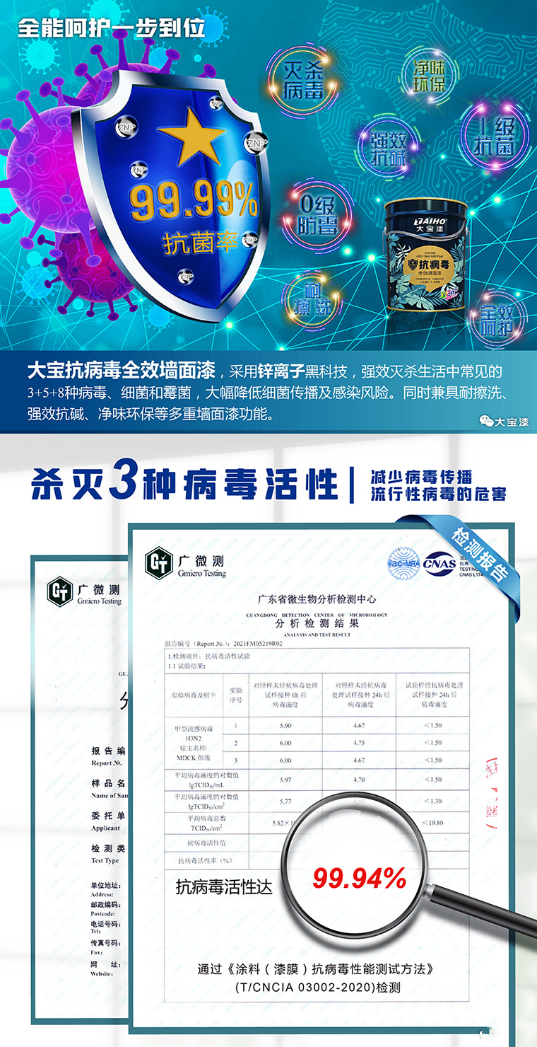 大寶抗病毒全效墻面漆,采用鋅離子黑科技,強效滅殺生活中常見的3+5+8種病毒、細菌和霉菌,大幅降低細菌傳播及感染風險。同時兼具耐擦洗、強效抗堿、凈味環保等多重墻面漆功能,大寶超強“鋅”生力,用專業和愛為家人筑起健康防護墻。