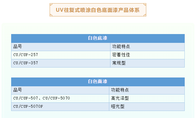 素材→UV往復式噴涂白色底漆(60-80g/㎡)→UV固化→輕砂→UV往復式噴涂白色底漆(100g/㎡)→UV固化→UV往復式噴涂白色底漆(100 g/㎡)→UV固化→砂光→UV往復式噴涂白色面漆(100-120 g/㎡)→UV固化