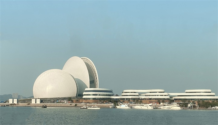 在餐廳用餐后,大家便前往珠海日月貝歌劇院。日月貝歌劇院是中國唯一建設(shè)在海島上的歌劇院,坐落于珠海情侶路野貍島海濱。大劇院建筑方案的創(chuàng)作構(gòu)思源于大海,用地總體布局形似從海中升起的美麗魚鰭烘托著純凈的雙貝造型,形成“珠生于貝,貝生于海”的意境。在這里,大家或在拍照留念,或坐在陰涼處欣賞美景。