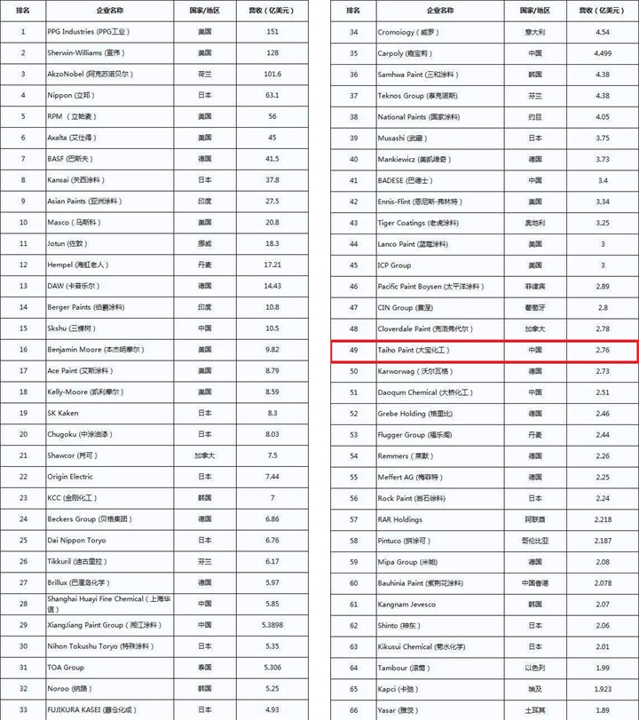 2020全球頂級涂料制造企業銷售額排行榜(前66名)