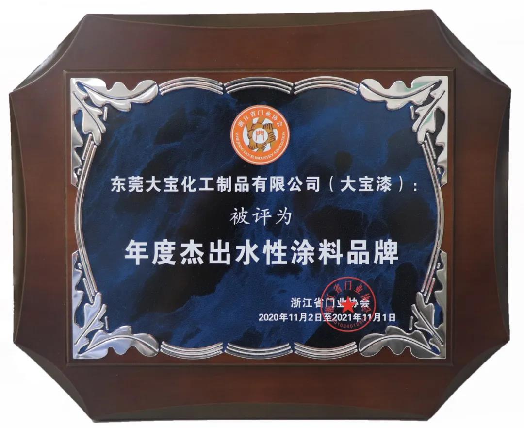 2020第七屆中國(guó)門業(yè)定制家居GDCC峰會(huì)暨浙江省門業(yè)協(xié)會(huì)年會(huì),大寶漆獲得“年度杰出水性涂料品牌”。