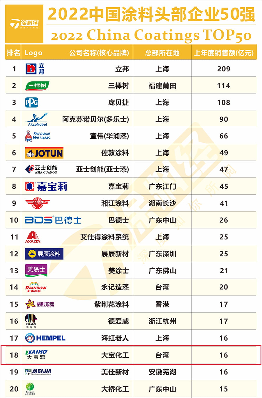 “2022中國涂料頭部企業50強”榜單的排名是依據上一年度銷售額?!爸袊苛掀髽I”,是指在中國(包括港澳臺)涂料市場上參與競爭的所有涂料企業,無論內資外資;只選取其在中國市場的銷售數據作為排行依據。