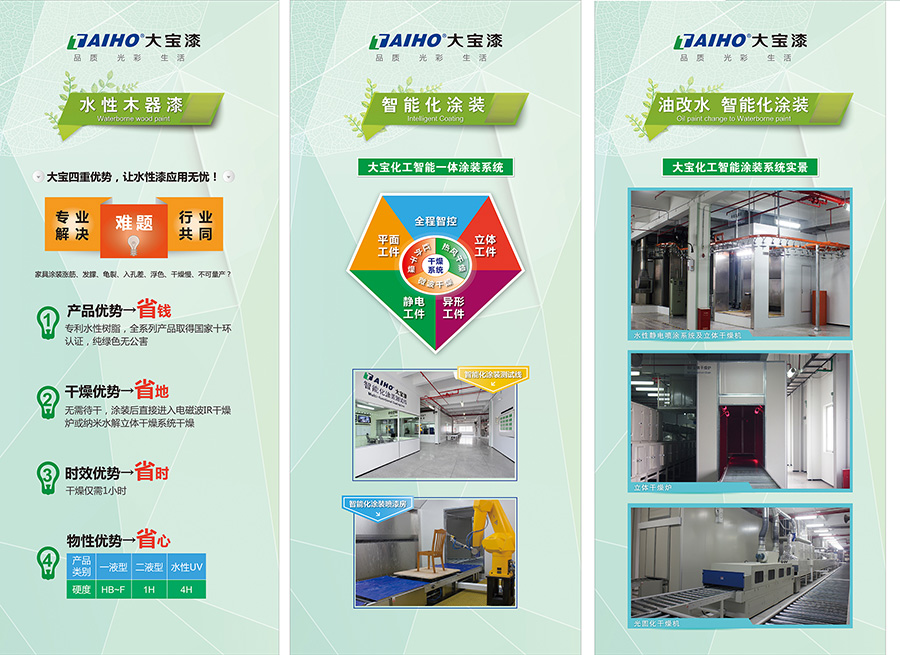 大寶漆經過多年的技術專研,打造出了水性內外墻面漆、水性木器漆等綠色環保產品,并推出水性木器涂料整體解決方案,針對家居行業面對水性漆干燥難題,斥巨資率先打造中國涂料行業首條大規模的智能化水性涂裝測試線,以便滿足客戶的立體工件、平面工件、異型工件等涂裝與干燥的多元化需求,一舉攻破行業油改水涂裝和干燥的重重難關,領先行業實現了家具廠環保自動化涂裝的可能性,為家具企業油改水的跨越做出了貢獻。