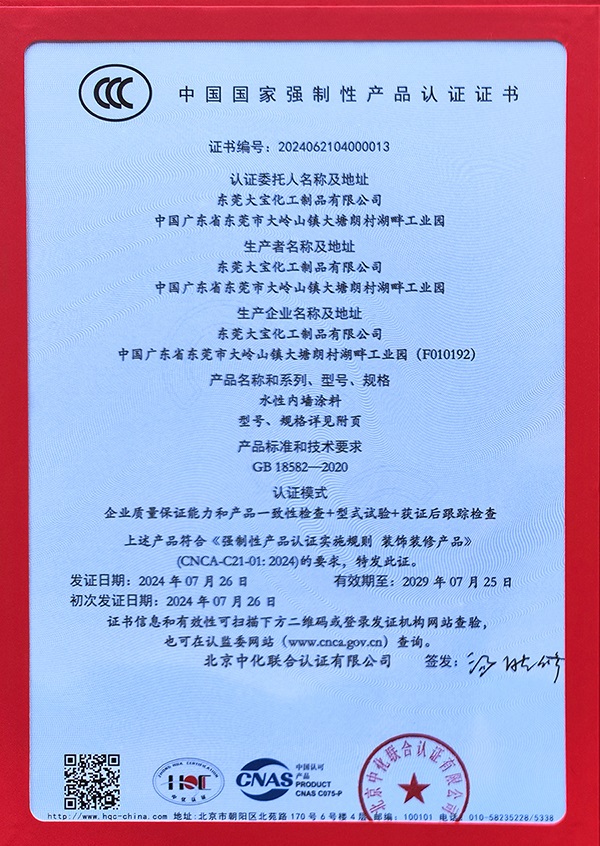 東莞大寶化工率先申請(qǐng)水性內(nèi)墻涂料CCC認(rèn)證,順利通過嚴(yán)格審核與評(píng)估,獲得行業(yè)首批水性內(nèi)墻涂料CCC認(rèn)證證書。