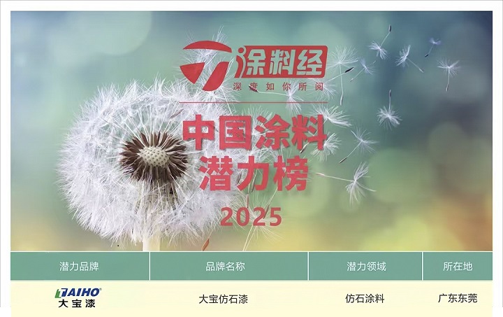2月12日,備受行業矚目的“2025中國涂料品牌潛力榜”正式揭曉,大寶仿石漆憑借其卓越的產品品質及強勁的市場表現,成功入選該榜單,標志著大寶仿石漆在涂料市場的發展潛力獲得了行業的高度認可。