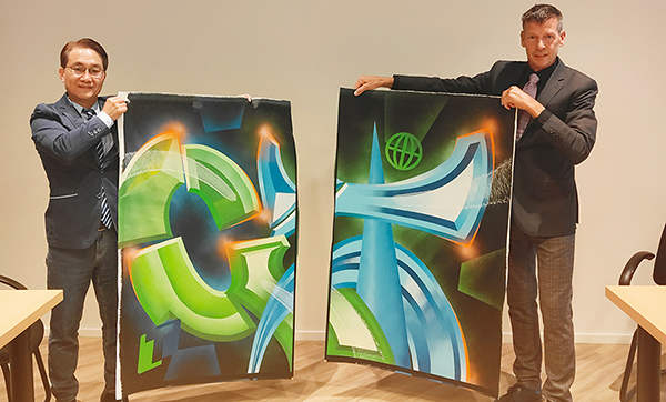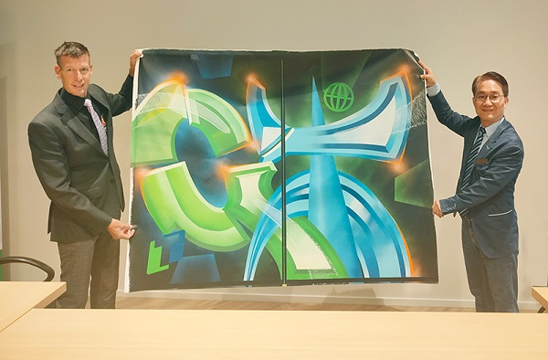 此次簽約儀式別具創(chuàng)意與情感意義,高樂伯總裁Kees特別邀請(qǐng)當(dāng)?shù)刂嫾乙浴癎”與“T”兩個(gè)字母為主題,分別代表Global Paint與Taiho Paint,創(chuàng)作一幅融合東西方藝術(shù)語匯的油畫作品。簽約當(dāng)日,雙方代表共同剪下畫作中央,各自保留一半,象征兩家企業(yè)跨越地域、文化的深度連結(jié)。