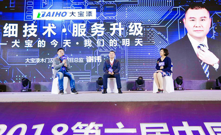 在“木門黑科技”高端對話環節中,謝總監與搜門網CEO石興、東威利總經理葉廣柱共同探討大寶漆在木門品質提升上的作用。