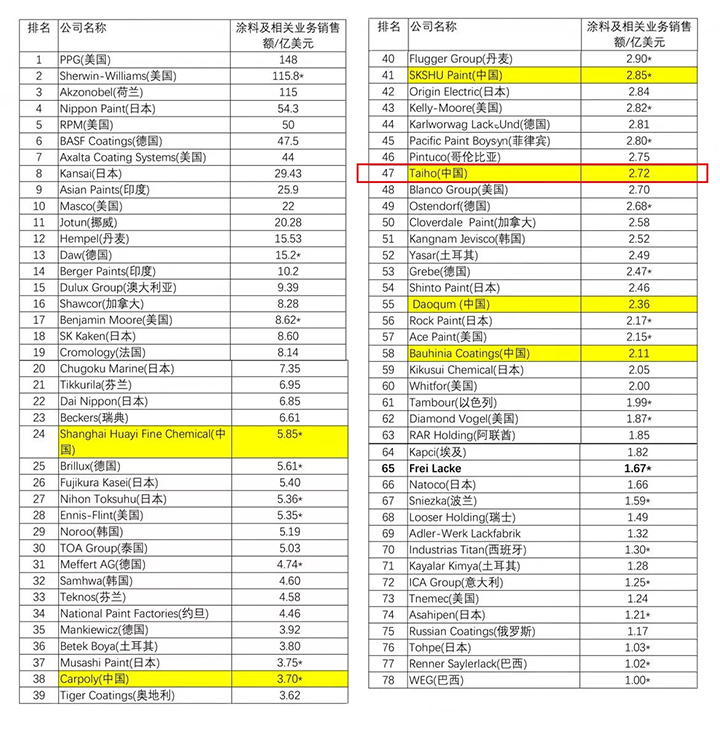 日前,美國Coatings World雜志(July 2018)最新發(fā)布2018年全球頂級(jí)涂料制造企業(yè)銷售額排行榜(前78名)(2018 Top Companies),中國6家涂料企業(yè)殺入重圍,比上年增加1家。作為中國著名涂料品牌,大寶漆連續(xù)多年登上該排行榜,此次在榜單中位列第47名,較上年提升8名。