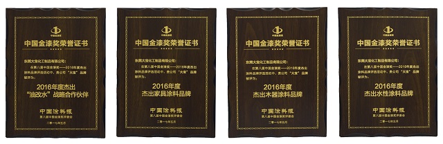會議頒發(fā)了在多個細分渠道領(lǐng)域的2016年度杰出涂料品牌,大寶漆憑借其臻于至善的品質(zhì)及消費者的支持,榮膺2016年度杰出“油改水”戰(zhàn)略合作伙伴、杰出木器裝修涂料品牌、杰出家具涂料品牌、杰出水性涂料品牌等4項大獎。同時,大寶漆經(jīng)銷商杭州啟納實業(yè)有限公司獲得了2016年度杰出家具涂料經(jīng)銷商獎項。大寶漆獨攬5個獎項,收獲頗豐。