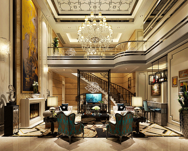 歐式客廳頂部喜用大型燈池,并用華麗的枝形吊燈營造氣氛。門窗上半部多做成圓弧形,并用帶有花紋的石膏線勾邊。室內有真正的壁爐或假壁爐造型。墻面一般使用高檔藝術壁材,或優質環保的藝術涂料,如造型多樣的大寶L’opera樓貝進口藝術涂料,來烘托豪華效果。