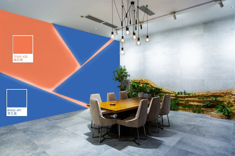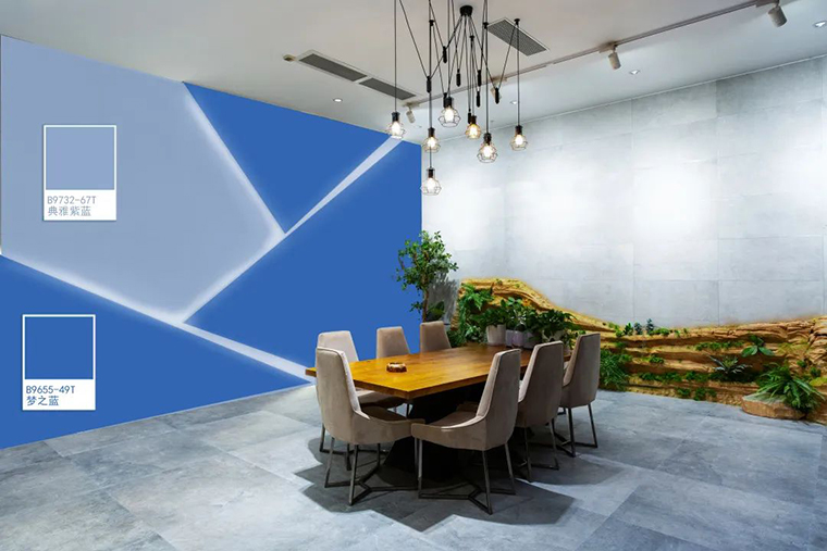 因?yàn)樗{(lán)色讓人明顯降低食欲。Pantone色彩研究所Leatrice Eiseman說過:藍(lán)色可以很好地表現(xiàn)出恒定和信任感,也能呈現(xiàn)出時髦的現(xiàn)代風(fēng)格。所以今天大寶色彩研發(fā)團(tuán)隊(duì)將通過夢之藍(lán)B9655-49D色系搭配,在餐廳中使用藍(lán)色,擺脫「藍(lán)色魔咒」!